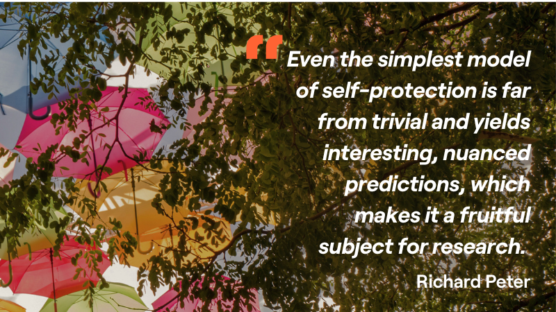 Richard Peter: The paper’s main contribution is a conceptual framework I developed to classify and catalog variations of the self-protection problem that researchers have studied since Ehrlich and Becker (1972) introduced the concept. I believe this framework will be useful for generating new ideas and broadening the scope of research on self-protection. Additional insights include a simple example that illustrates why downside risk aversion matters for self-protection and a set of directions for future research on the topic.