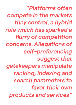 Platforms often compete in the markets they control, a hybrid role which has sparked a flurry of competition concerns. In particular, allegations of self-preferencing suggest that gatekeepers manipulate ranking, indexing and search parameters to favor their own products and services. In 2017, for instance, the European Commission fined Google for abusing its dominance, systematically giving prominent placement to its shopping comparison service and demoting rivals in search results. Even “pure” platforms – like Airbnb or Booking, which operate markets, but do not compete in them – may enter “sweet deals” with specific business users.