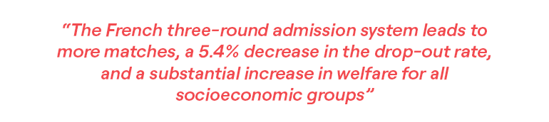 Compared with a standard one-round system where students must accept or reject immediately, France’s three-round system leads to more and better matches, a 5.4% decrease in the share of students who drop out without a degree, and a substantial welfare gain for all socioeconomic groups. In particular, the share of students accepting an offer through the platform rises by three percentage points.
