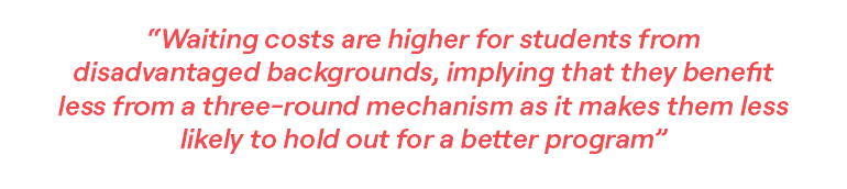 Unfortunately, the benefits are unevenly spread. Among students who do not initially receive their preferred offer, only 55% choose to delay. This is because waiting costs can be large. On average, we calculate that they are equivalent to the cost of studying 172km farther away from home, outweighing the benefits of receiving a better offer. These costs are even higher for poorer students, who place a higher value on immediate certainty, and can least afford to wait for better offers.