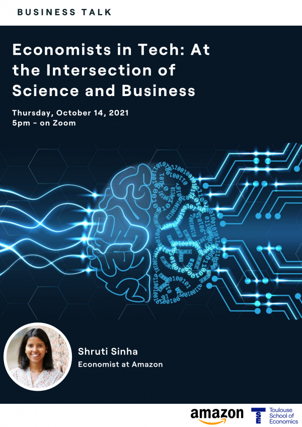 Le service carrières est heureux d'accueillir Shruti Sinha, chercheure associée à TSE et Economiste chez Amazon le jeudi 14 octobre 2021 à 17H00, elle animera une conférence en ligne "Economists in Tech: At the Intersection of Science and Business".