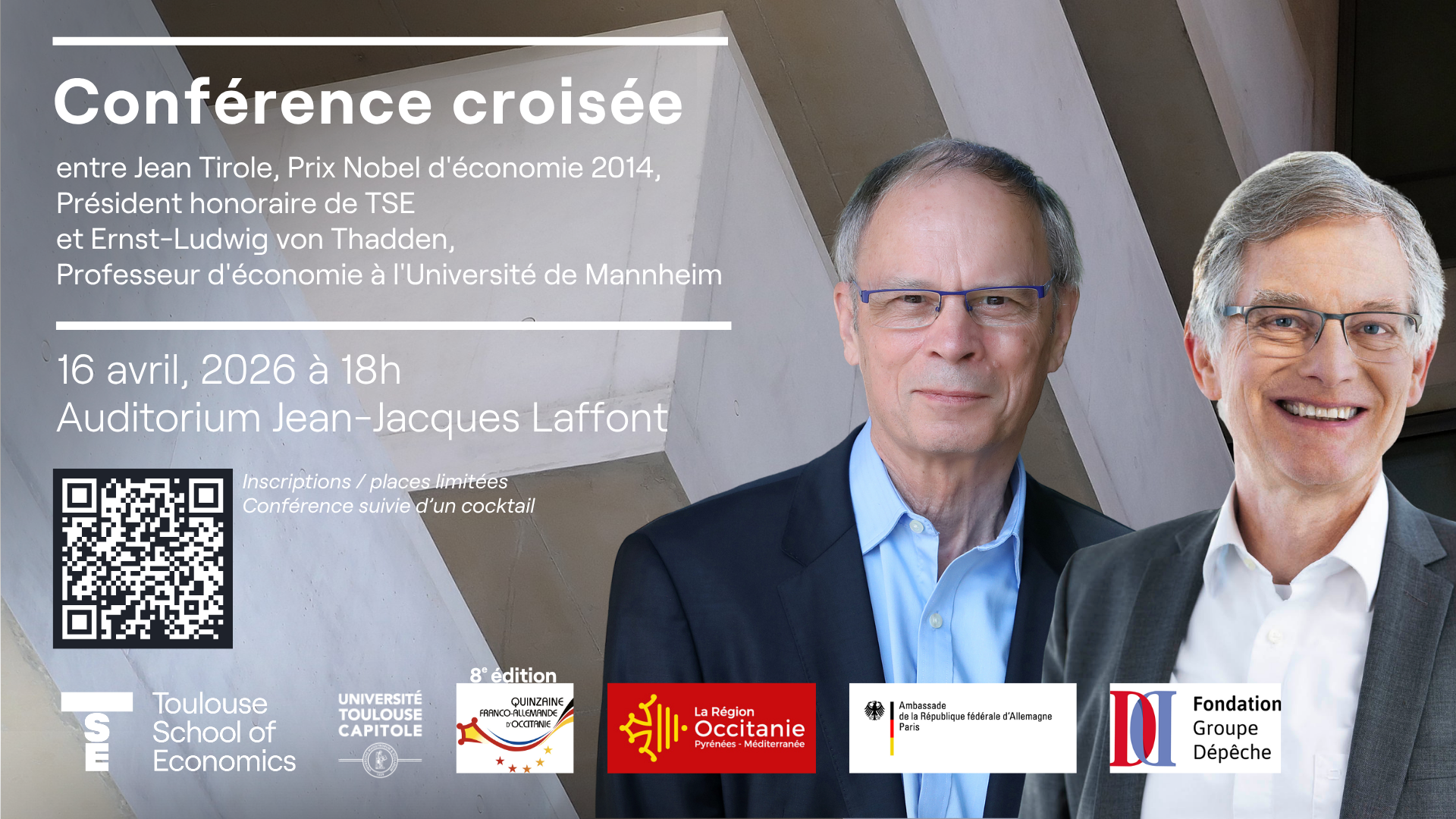 Dans le cadre de la quinzaine franco-allemande d'Occitanie, La Fondation Groupe Dépêche organise une conférence croisée entre Jean Tirole Prix Nobel d'économie, Président Honoraire de TSE et Ernst-Ludwig von Thadden, Professeur d'économie à l'Université de Mannheim et vient ainsi clôturer la la 8ème édition de cette quinzaine franco-allemande d'Occitanie.