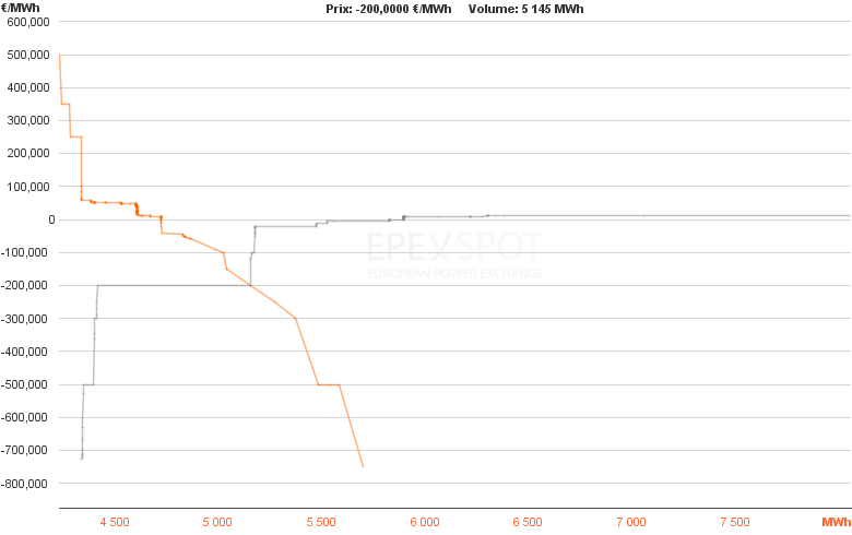 [1] Le 16 juin 2013 le prix a commencé à être négatif à 3heures du matin, a décru jusqu'à atteindre -200€/MWh entre 5 et 8 heures, puis est remonté pour fluctuer autour de 0 avant de rebaisser dans l'après-midi. (https://www.epexspot.com/fr/donnees_de_marche/dayaheadfixing/courbes-agregees/auction-aggregated-curve/2013-06-16/FR/05/3).