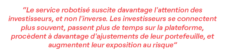 Nos données indiquent le contraire. Le service robotisé suscite davantage l'attention des investisseurs, et non l'inverse. Après avoir adopté le service, les investisseurs se connectent plus souvent, passent plus de temps sur la plateforme, procèdent à davantage d'ajustements de leur portefeuille en réponse aux chocs du marché ou aux nouvelles opportunités, et augmentent leur exposition au risque.