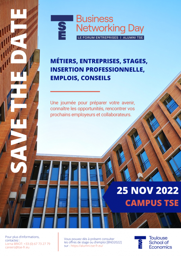 Ce forum organisé chaque année à Toulouse par TSE, est une occasion unique pour les étudiants d'être en contact avec différentes entreprises / institutions de différents secteurs et de découvrir les possibilités d'emplois et de stages, et de discuter avec des recruteurs potentiels. Nous accueillons également à cette occasion un certain nombre d'anciens élèves des TSE travaillant actuellement dans des entreprises et des institutions internationales, désireux de recruter des étudiants des TSE et prêts à partager leurs expériences de parcours professionnel.