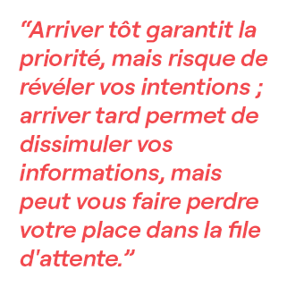 Cette règle crée un compromis stratégique. Arriver tôt garantit la priorité, mais risque de révéler vos intentions à vos concurrents. Arriver tard permet de dissimuler vos informations, mais peut vous faire perdre votre place dans la file d'attente. Le titre de notre article « Click first or last? », résume bien ce dilemme. Nous voulions comprendre qui passe ses ordres tôt ou tard, pourquoi et comment leur comportement détermine le cours d'ouverture des actions.