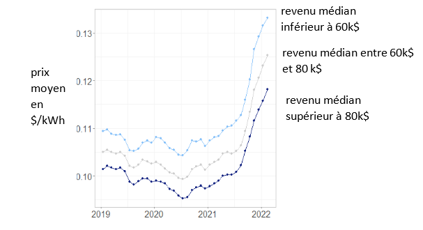 Aux USA, les Etats ont adopté des règles hétérogènes pour la vente au détail de l’électricité et du gaz (voir ICI). Pour l’électricité, la majorité des Etats en est restée au monopole régulé, huit ont adopté des formes de concurrence limitée, et treize ont choisi la concurrence totale. C’est le cas de l’Etat du Maryland où se trouve la ville de Baltimore qui a fait l’objet d’une étude sur les tarifs résidentiels. Les consommateurs y sont libres de choisir leur fournisseur, ou de souscrire au tarif régulé de l’opérateur historique, Baltimore Gas and Electric Company (BGE), et les vendeurs sont libres de leur politique de marketing et de prix. Le graphique ci-dessous représente, sur un peu plus de 4 ans, l’évolution du prix moyen du kilowattheure (en dollars) facturé aux consommateurs résidentiels de la zone desservie par BGE. Après la légère tendance à la baisse du prix en 2019 et 2020, on voit que l’envolée de 2021-2022 n’a pas touché que l’Europe. Mais le point qui retient l’attention est que la courbe du haut concerne les ménages vivant dans les quartiers (identifiés par le code postal) où le revenu médian est inférieur à 60 000 dollars, alors que les prix représentés par la courbe du bas sont ceux payés par les ménages dont le revenu médian est supérieur à 80 000 dollars.