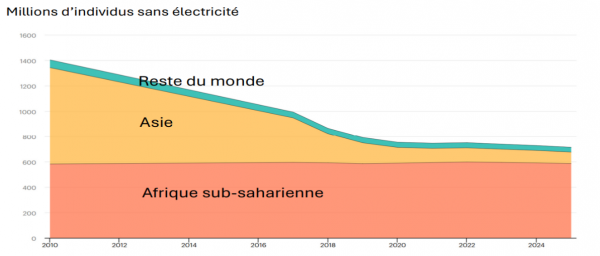 Comme le montre le graphique ci-dessous (AIE), la population sans accès à l’électricité s’est fortement réduite en Asie au cours de la période 2010-2020, alors qu’elle se maintient en AS.  Au rythme d’investissement actuel, environ 520 millions d’Africains n'auront toujours pas accès à l'électricité en 2035.