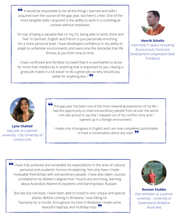 A year out to take part in one or several internships in France or abroad, various personal projects such as humanitarian or charitable work, civic service, entrepreneurial projects, taking training in another area...
